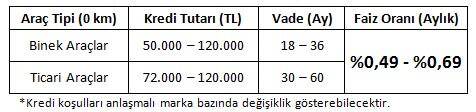 Fiyatı 72 bin ila 120 bin arasında değişen sıfır kilometre ticari araçlarda ise 30-60 ay vadeli kredi; aylık yüzde 0.49-0.69 faiz oranı ile kullanılabilecek.