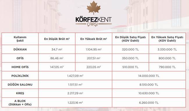 Körfezkent Çarşı fiyat listesinde ofislerin büyüklüğü brüt 86,46 metrekare ile 207,51 metrekare arasında, fiyatları da 350 bin TL ile 800 bin TL arasında farklılık gösteriyor.