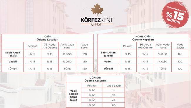 Sabit Artan Taksitli ve Vadeli ödeme seçeneklerinde peşinat oranı yüzde 15 olarak belirlenirken 36. Ayda Ara Ödeme Oranı da yüzde 15, her iki ödeme koşulunda da Aylık Vade Farkı yüzde 0.50 ve Vade Sayısı 120 olarak belirlendi. Körfezkent Çarşı Ofislerdoe TÜFE’li ödeme yapmak isteyenler yüzde 15 peşinat ve 36. Ayda yüzde 15 Ara Ödeme ile 120 ay Vade Sayısından faydalanırken Aylık Vade Farkı TÜFE oranında gerçekleşiyor.