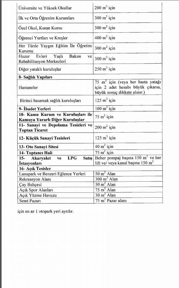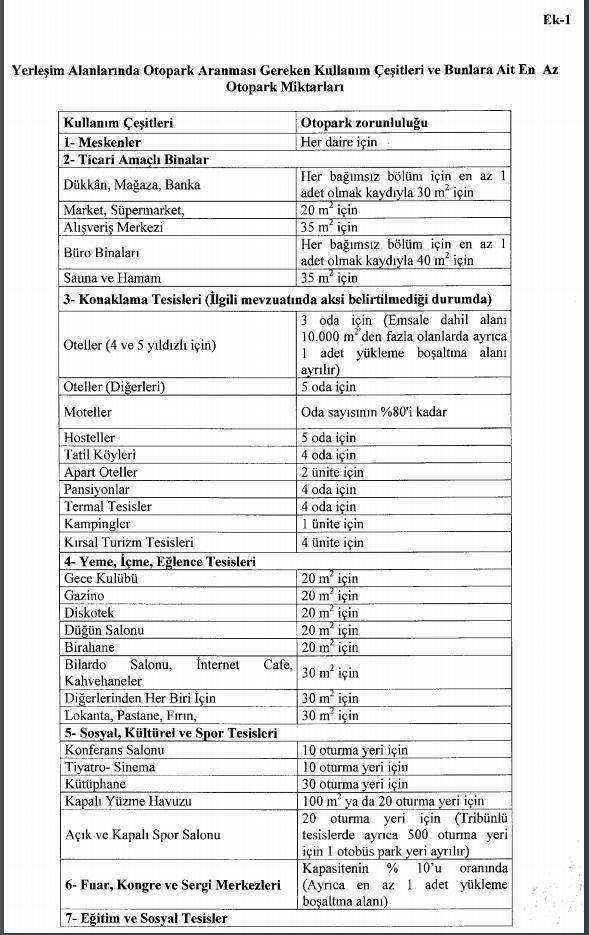 MADDE 8 – (1) Otopark aranması gereken kullanımlar ve miktarları Ek-1’de yer almaktadır.