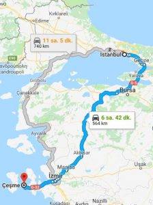 Google haritalar üzerinden de bakıldığında Çeşme İstanbul’a; E881 karayolu üzerinden Bursa, Balıkesir ve İzmir’i geçerek 564 km ve 6 saat 40 dakika uzaklıkta…