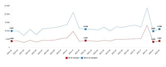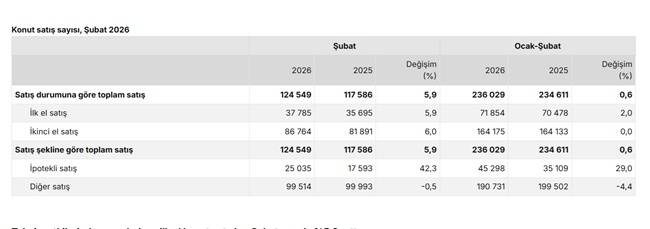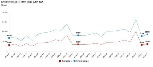 Türkiye genelinde ilk el konut satış sayısı Şubat ayında bir önceki yılın aynı ayına göre yüzde 5,9 oranında artarak 37 bin 785 oldu. İkinci el konut satışları ise Şubat ayında bir önceki yılın aynı ayına göre yüzde 6,0 oranında artarak 86 bin 764 oldu. Toplam konut satışları içinde ilk el konut satışlarının payı yüzde 30,3, ikinci el konut satışlarının payı yüzde 69,7 oldu.
