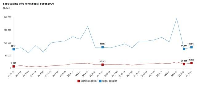 Türkiye genelinde ipotekli konut satışları Şubat ayında bir önceki yılın aynı ayına göre yüzde 42,3 oranında artarak 25 bin 35 oldu. Diğer konut satışları ise Şubat ayında bir önceki yılın aynı ayına göre yüzde 0,5 oranında azalarak 99 bin 514 oldu. Toplam konut satışları içinde ipotekli satışların payı yüzde 20,1 diğer satışların payı yüzde 79,9 olarak gerçekleşti.