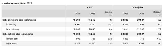 Türkiye genelinde ipotekli iş yeri satışları Şubat ayında bir önceki yılın aynı ayına göre yüzde 62,8 oranında artarak 692 oldu. Diğer iş yeri satışları ise Şubat ayında bir önceki yılın aynı ayına göre yüzde 3,0 oranında azalarak 14 bin 377 oldu.