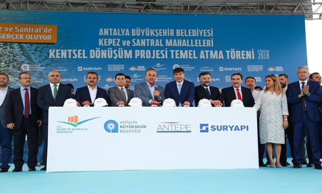 Sur Yapı’nın Kepez-Santral bölgesinde 8 milyar TL yatırımla hayata geçirdiği Antalya Projesi’nin resmi temel atma töreni dün gerçekleştirildi. Törene, Dışişleri Bakanı Mevlüt Çavuşoğlu, Çevre ve Şehircilik Bakanı Mehmet Özhaseki, Antalya Valisi Münir Karaloğlu ve Büyükşehir Belediye Başkanı Menderes Türel katıldı.