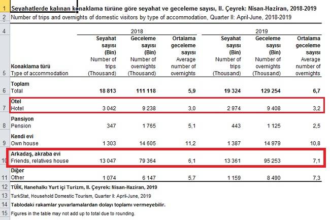 Bu çeyrekte seyahate çıkanlar 95 milyon 253 bin geceleme sayısı ile en çok “arkadaş, akraba evinde” kaldı. Konaklama türlerine göre geceleme sayısında ikinci sırada 14 milyon 979 bin geceleme ile “kendi evi” yer alırken, “otel” 9 milyon 408 bin geceleme sayısı ile üçüncü sırada yer aldı.
