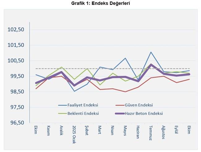 Ekim ayında endeks değerleri, eylül ayına oldukça yakın seyretmiştir. Güven Endeksi hafif bir toparlanma sergilemiş olsa da değer olarak en düşük endeks durumundadır. Faaliyet Endeksi sınırlı bir yükseliş, Beklenti Endeksi ise sınırlı bir azalış göstermiştir. Son olarak Birleşik Beton Endeksi negatif tarafta kalarak bir önceki aya paralel bir hareket sergilemiştir.
