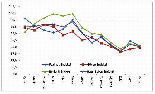 Türkiye Hazır Beton Birliğinin (THBB) hazırladığı Hazır Beton Endeksi Kasım Ayı Raporu’na göre Faaliyet Endeksi eylül ayında yılın en kötü değerini aldıktan sonra ekim ayındaki toparlanmasına kasım ayında devam edemedi. Kasım ayında inşaat faaliyetleri oldukça sınırlı düzeyde kaldı. Bütün endeksler halen eşik değerin altında olması da inşaat ve bağlantılı sektörlerdeki durgunluğun devam ettiğine işaret etti. Rapor, inşaat sektörüne güvenin oldukça düşük olduğunu ortaya koyarken son 2 aydır Güven Endeksi’ndeki yükselme dikkat çekti.