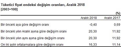 TÜFE’de (2003=100) 2018 yılı Aralık ayında bir önceki aya göre %0,40 düşüş, bir önceki yılın Aralık ayına göre %20,30, bir önceki yılın aynı ayına göre %20,30 ve on iki aylık ortalamalara göre %16,33 artış gerçekleşti.