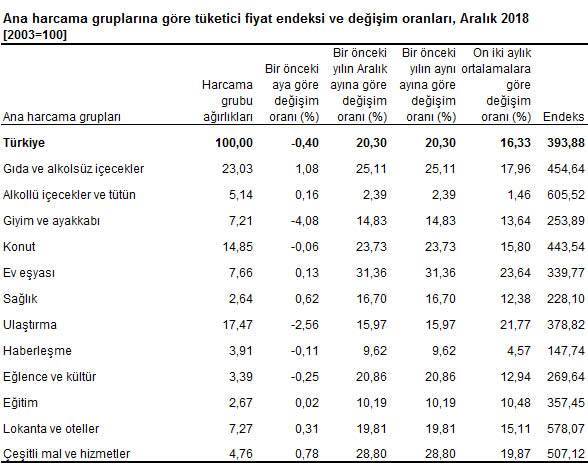 Tüketici fiyat endeksi, Aralık 2018
