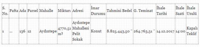 Tuzla Belediye Başkanlığı, mülkiyeti belediyeye ait Aydıntepe Mahallesi Pelit Sokak, 136 ada 12 parsel üzerindeki 4770.51 metrekare büyüklüğündeki konut arsasını 8 milyon 825 bin 443.50 TL tahmini bedel ile kapalı teklif usulü ihale yoluyla satışa çıkardı.