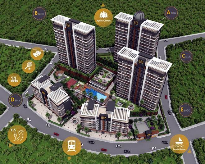 Adalar manzarasıyla beğeni toplayan projede ayrıca sosyal donatı alanları olarak açık yüzme havuzu, çocuk yüzme havuzu, mini sinema salonu, fitness center, SPA, sauna, buhar odası, şok havuzu, Türk hamamı ve kapalı otopark yer alıyor.