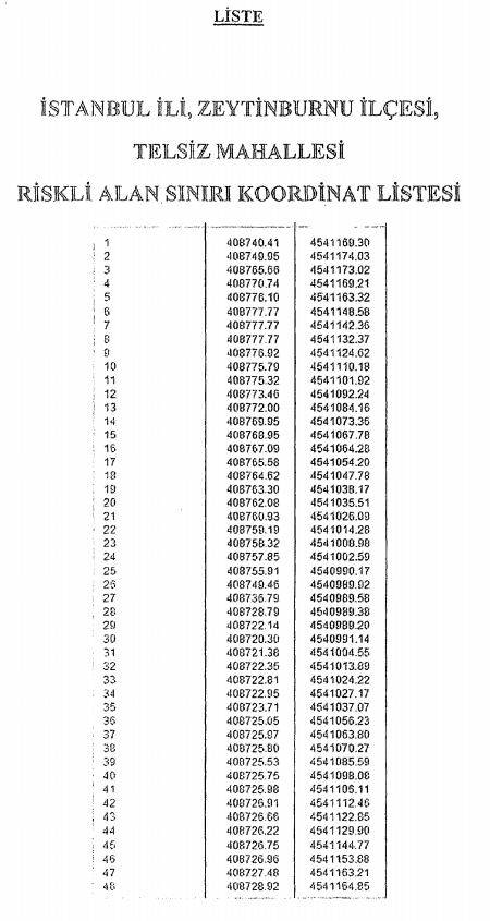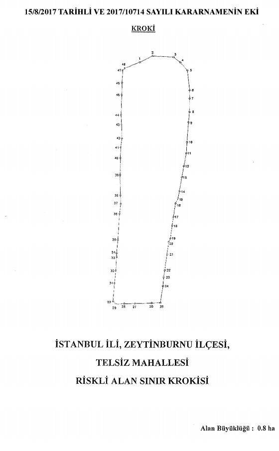 Zeytinburnu Telsiz Mahallesi’nde riskli alan ilan edilen bölgenin sınır krokisi ve koordinatları şöyle;
