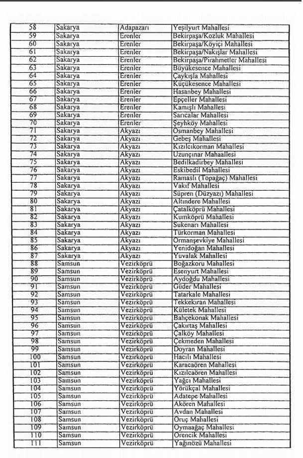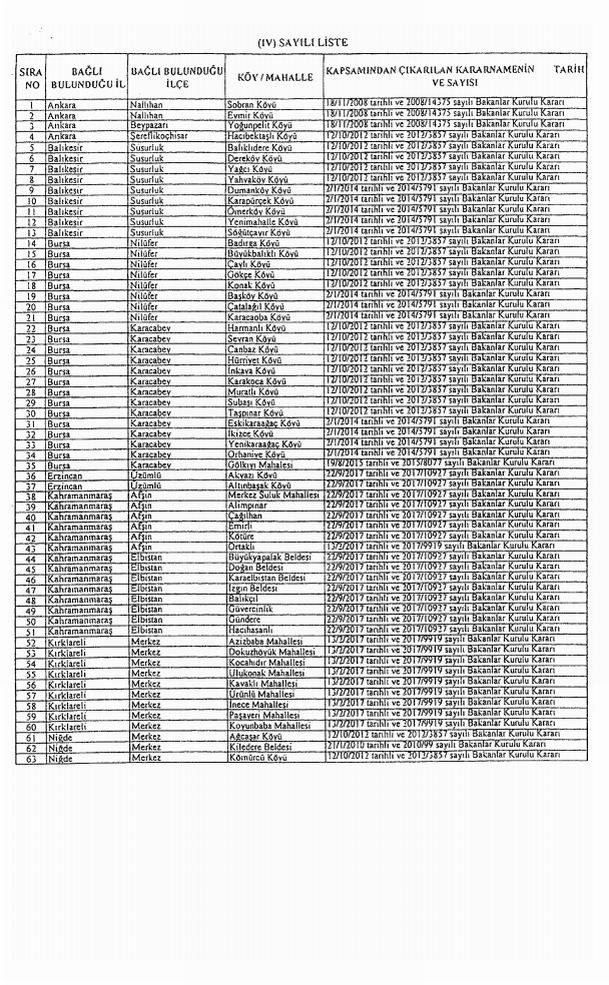 4- Ekli (IV) sayılı listede yer alan yerleşim birimlerinin aynı listede gösterilen Bakanlar Kurulu kararları kapsamından çıkarılması;