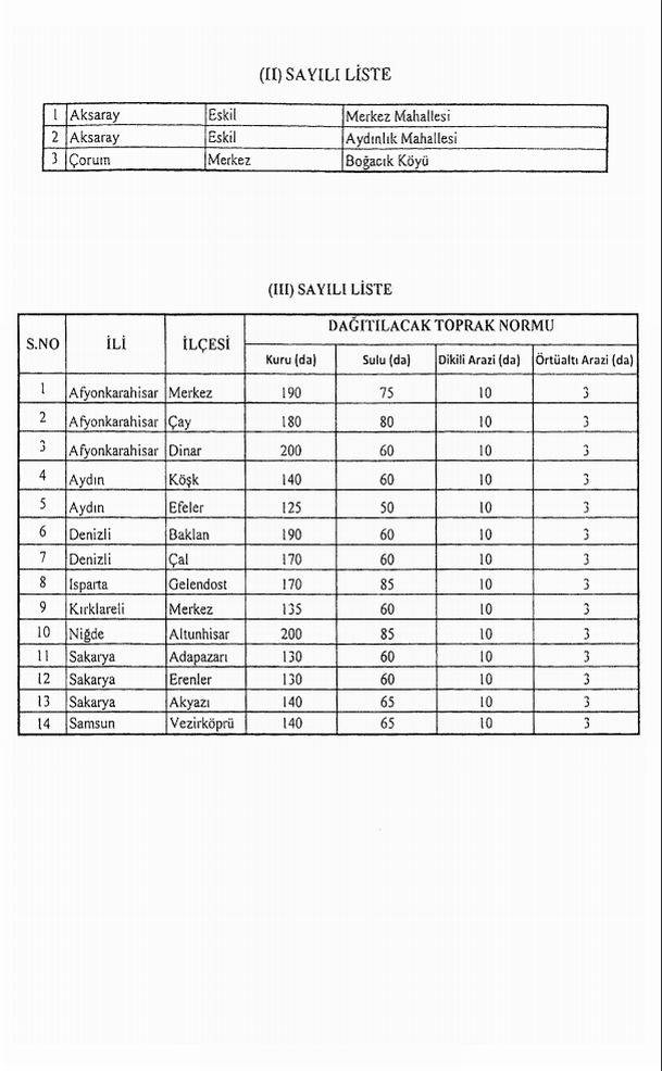 3- Ekli (III) sayılı listede yer alan yerleşim alanlarında dağıtılacak toprak normunun aynı listede gösterildiği şekilde belirlenmesi,